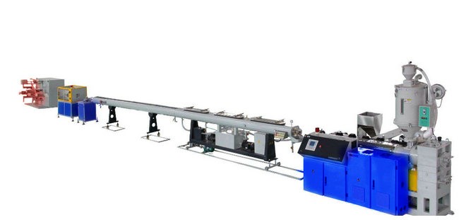原料+色母料→混合→真空上料→原料干燥→單螺桿擠出機(jī)→四色線擠出機(jī)→籃式或是螺旋模具→定徑套→噴淋真空定型箱→噴淋真空定型箱→噴淋冷卻水箱→噴淋冷卻水箱→色帶印字機(jī)→履帶式牽引機(jī)→行星切割機(jī)→管材堆放架→成品檢測包裝。